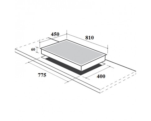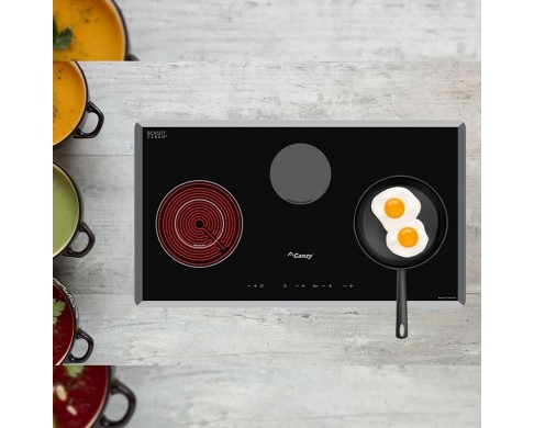 - Bếp điện từ ba : 2 vùng từ và 1 vùng hồng ngoại , sử dụng mặt kính Schott Ceran vát 2 cạnh bo góc