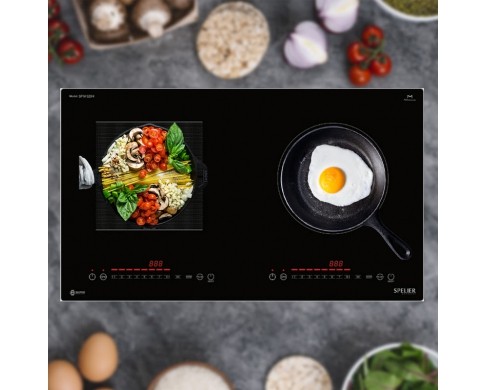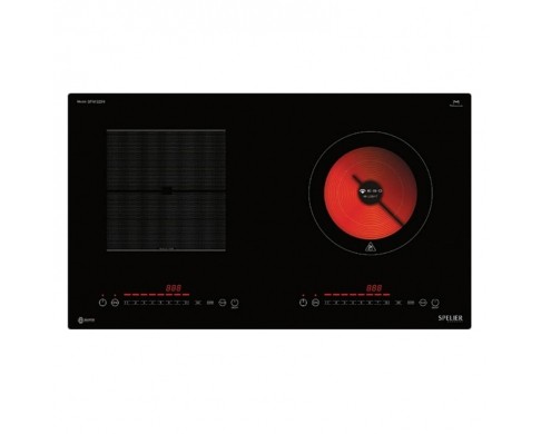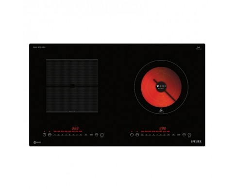 Bếp điện từ Spelier SPM-929H gồm 2 vùng nấu có tổng công suất 4400W, 1 vùng nấu từ có khả năng đun nấu siêu nhanh và tiết kiệm điện năng có thể đạt mức công suất tối đa 2200W và 1 vùng nấu hồng ngoại sử dụng mâm nhiệt E.G.O 2 vòng nhiệt có công suất tối đa 2200W