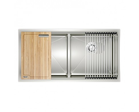 Phong cách chậu rửa bát lắp âm hiện nay đang được ưa chuộng bởi sự thẩm mỹ và tạo ra không gian bàn bếp tối giản. Người dùng sẽ thuận lợi hơn khi thao tác vệ sinh bàn đá quanh khu vực bồn rửa nhờ việc lắp âm hoàn toàn dưới mặt đá. Model KN8745DUB thuộc bộ sưu tập Undermount Series của Konox, chậu được thiết kế kích thước rộng dành cho khoang tủ 850mm trở lên với phong cách thiết kế vuông hiện đại, công nghệ tạo gờ hai bên giúp tích hợp thớt gỗ và các phụ kiện. Người dùng có thể thao tác thái cắt đồ nấu ngay trên mặt chậu, tạo nên trải nghiệm mới lạ và tiện ích độc đáo. KN8745DUB giúp chậu âm trở nên hoàn hảo và đẳng cấp hơn, tạo điểm nhấn nổi bật trong gian bếp nhà bạn.