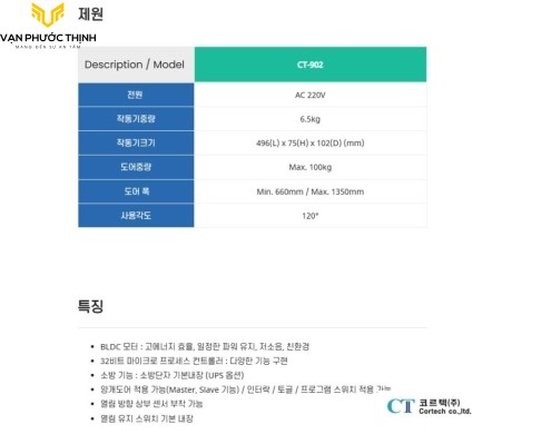 Đến từ thương hiệu danh tiếng CORTECH – Hàn Quốc, model CT-902 không chỉ đơn thuần là một thiết bị đóng mở cửa. Nó là sự kết hợp hoàn hảo giữa kỹ thuật cơ khí chính xác và hệ thống điều khiển thông minh, mang lại trải nghiệm di chuyển không chạm đẳng cấp. Với thiết kế nhỏ gọn nhưng mạnh mẽ, sản phẩm này đang dẫn đầu xu hướng lắp đặt cho các không gian đòi hỏi tính thẩm mỹ cao và sự an toàn tuyệt đối.