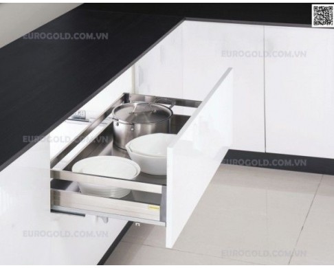 - Tích hợp 2 thanh ray trượt âm giảm chấn bắt trực tiếp vào thành tủ chắc chắn, chịu được tải trọng lớn, kéo đẩy nhẹ nhàng, không lo va chạm và không phát ra tiếng ồn.