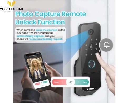 Khác với các dòng khóa cổng thông thường, TOHO TH705 tích hợp một camera sắc nét ở mặt ngoài. Khi khách nhấn nút chuông, hình ảnh sẽ được truyền trực tiếp về màn hình hiển thị bên trong nhà (mặt sau khóa) hoặc điện thoại của gia chủ. Tính năng này giúp nhận diện khách chính xác trước khi cho phép vào nhà.