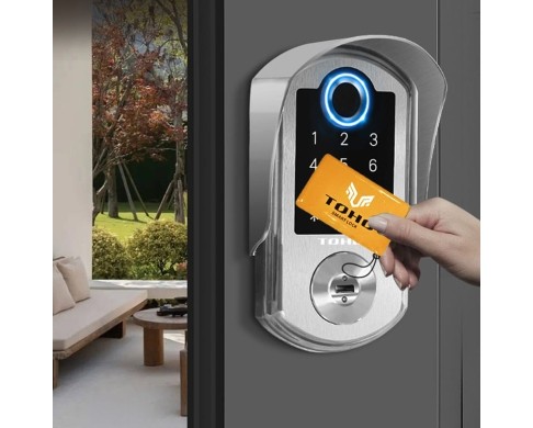 Khóa thông minh TOHO TH604 tích hợp mật mã, vân tay 2 chiều, thẻ từ, chìa khóa cơ, remote và app Tuya. Tương thích với cửa inox, cửa sắt, cửa gỗ, có khả năng chống nước IP68 và khóa chống sao chép.
