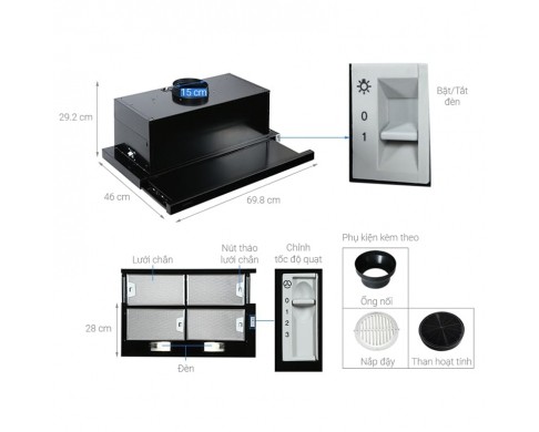 - Máy hút mùi lắp đặt âm tủ, kích thước 700mm
