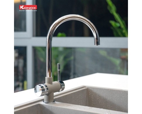 - Vòi rửa bát 3 đường nước: 2 đường nóng lạnh + 1 đường kết nối với máy lọc nước uống RO